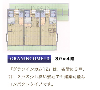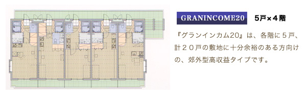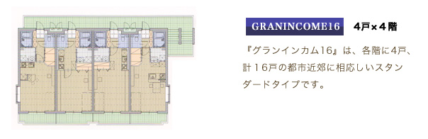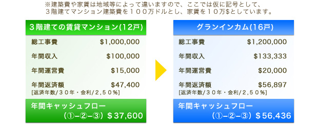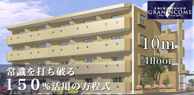 3階建てのプランと『グランインカム』の4階建てプランを比較した場合、1階(1層)分増えることにより同じ家賃設定でもオーナー様の手取り収入(借入返済後の収入)が従来に比べ1.5倍となります。(当社比)