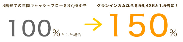 従来の工法により建てたマンションから得る収入(キャッシュフロー)を100%とした場合、150%の収入を実現する工法。それが『グランインカム』です。
